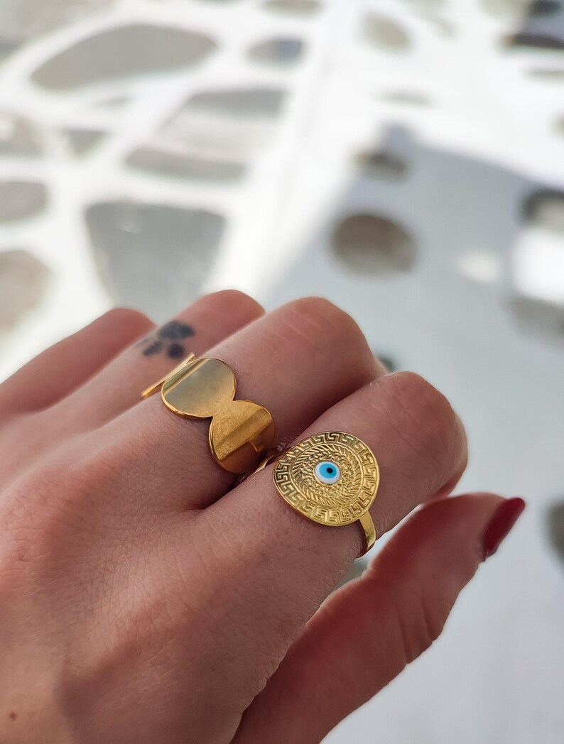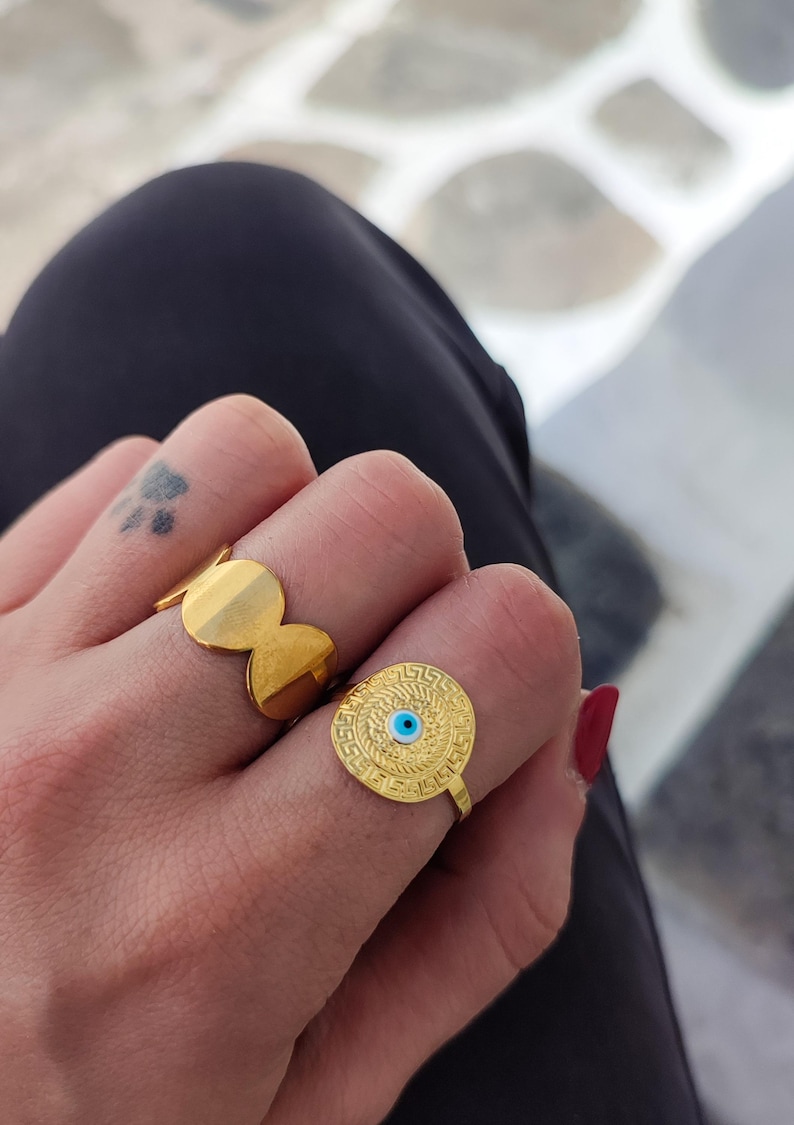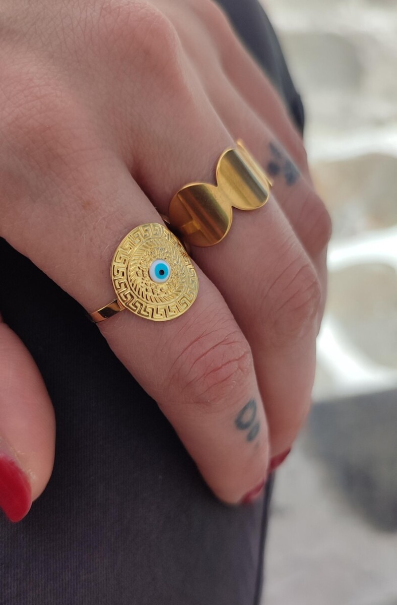 Ένα μίνιμαλ σχέδιο δαχτυλιδιού μπάντα και δαχτυλίδι με το κακό μάτι με ένα πανέμορφο σχέδιο Μαίανδρος που μπορείτε να απολαύσετε στην καθημερινότητα σας!