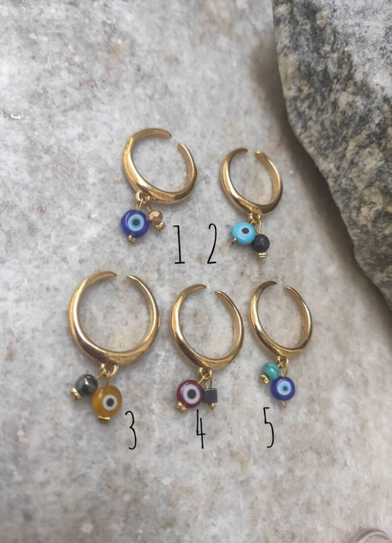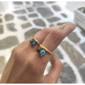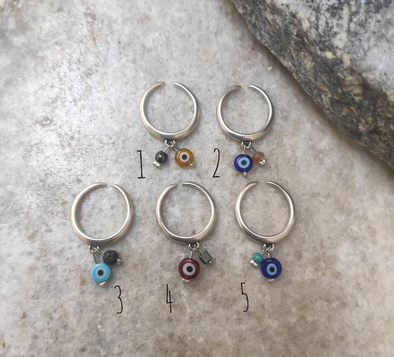 Κάθε δαχτυλίδι έχει ένα κακό μάτι για προστασία και ένα μικρό πολύτιμο λίθο.