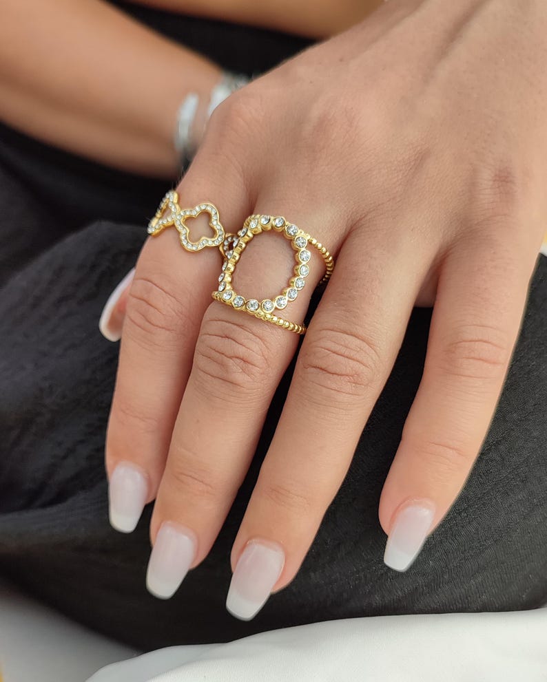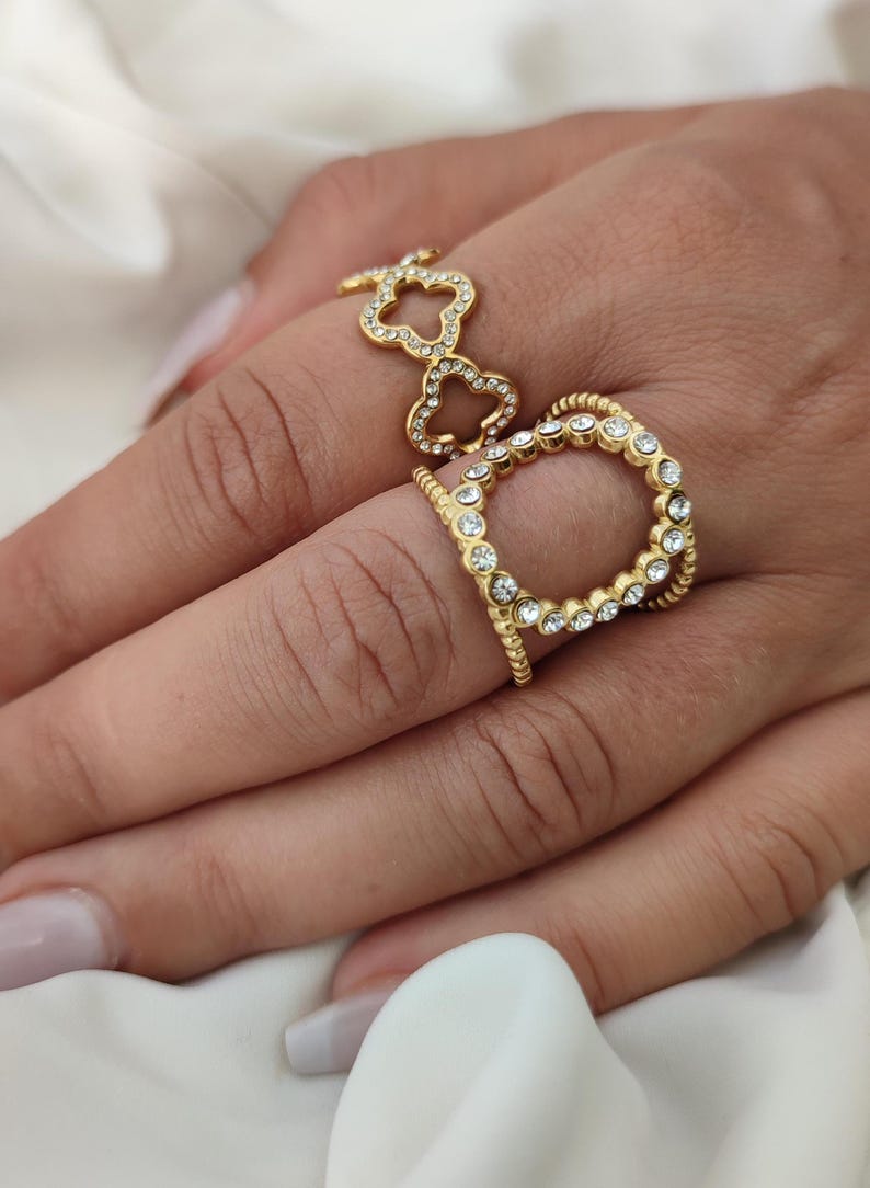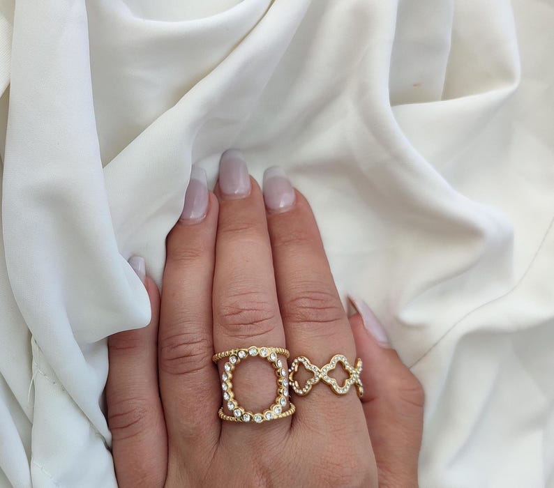 Πολύ εντυπωσιακά χρυσά δαχτυλίδια με γεωμετρικά σχήματα και κρύσταλλα που θα λατρέψει κάθε γυναίκα. Αυτά τα ρυθμιζόμενα δαχτυλίδια μπορούν να πωληθούν ξεχωριστά ή μπορούν να συνδυαστούν υπέροχα μεταξύ τους για μια πολύ κομψή εμφάνιση.